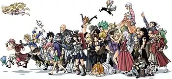 The series focuses on the titular guild, Fairy Tail (妖精の尻尾, Fearī Teiru), with the main protagonists constituting what their fellow members regard to be the guild's most powerful team because of their high magical strength and teamwork.[ch. 22] It initially consists of Lucy Heartfilia, Natsu Dragneel, and Happy at the suggestion of the celestial spirit Plue shortly after Lucy's induction into the guild,[ch. 4] and later expands to include Gray Fullbuster and Erza Scarlet after several shared missions together.[ch. 69] Wendy Marvell and Carla are also considered to be members of the team.