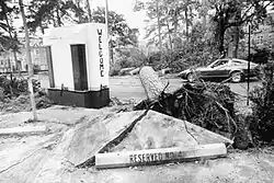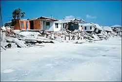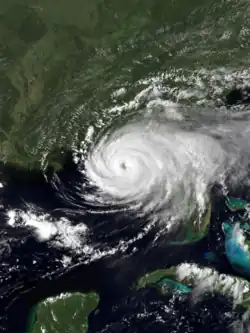 • September 23, 1975- Hurricane Eloise makes landfall near Destin with winds of about 125 mph (200 km/h), producing light precipitation across the peninsula with heavier amounts near the landfall location peaking at 14.9 inches (380 mm) at Eglin Air Force Base.[3] Hurricane-force winds and storm surge of up to 16 feet (4.9 m) across the panhandle destroy 500 small businesses and damage or destroy 8,000 houses. Damage in the state totals $100 million (1975 USD, $400 million 2008 USD).[4]