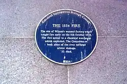East side of south tower, Tyne Bridge, Hillgate.[11] | 2004[nb 1] | At 12.30am on Friday 6 October 1854, Wilson & Sons Worsted Manufactory at Gateshead quayside caught fire and the intense heat ignited sulphur and other combustibles in the nearby Bertrams Warehouse. The subsequent explosion resulted in the complete destruction of most of Gateshead and Newcastle quaysides and the loss of 53 lives.[57][58] |