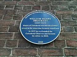 King James Street (off Old Durham Road), Gateshead.[24] | 2010 | Brockett founded the first Gateshead newspaper, The Gateshead Observer, in 1837. He was editor of the paper from 1860 until his death in 1867. He was also heavily involved in local politics; he was a local councillor, alderman and Mayor of Gateshead in 1839–40.[24][25] |
