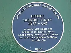Outer wall, William IV public house, High Street, Gateshead.[29] | 1995 | Born and bred in Gateshead,[30] Ridley was a coal miner who was less notable in his lifetime than his brother[31] but is now remembered as composer and performer of the Blaydon Races. The plaque is located on the site of his former home.[32] |