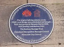 West side of the central pier, High Level Bridge[43] | 2008 | Plaque commemorating the original lamps which still span the length of the bridge. A£171,000 project to restore these and convert them from gas to electric was completed in 2008 as part of a wider £40m bridge restoration project. The completed work was awarded a Grand Prize Europa Nostra Award in 2009.[46][47] |