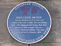 East side of the central pier, High Level Bridge[43] | 2008 | Opened in 1845, the High Level Bridge linking Gateshead and Newcastle upon Tyne over the Tyne was the first bridge in the world to combine road and rail travel.[44] Designed by Robert Stephenson, it is now a Grade I listed bridge.[45] |
