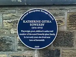 Entrance to The Drive, Durham Road, Low Fell.[40] | 2009 | Sowerby, described by The Spectator in 2013 as a playwright, suffragette and Fabian,[41] was the daughter of a noted Gateshead glass maker and grew up in the town. Despite having been a "forgotten playwright" during much of her life and after her death in 1970, she is best known for her critically acclaimed play Rutherford and Son.[42] |