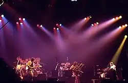 Genesis auditioned several potential replacements for Gabriel and even briefly considered continuing as an instrumental group, before Collins eventually started performing lead vocals for their next album, A Trick of the Tail, and took on the role full-time.[17] To allow him to focus on performing vocals, drums on the Trick of the Tail Tour were performed by Bill Bruford.[18] In December 1976, it was announced that Bruford had been replaced by Chester Thompson.[19] Collins continued to play the drums on all of the band's studio recordings and he continued to play drums in concert for certain songs, including extended instrumental sections, often playing percussion onstage while singing. The band's second live album, Seconds Out, released in late 1977, mostly includes recordings from the 1977 tour with Thompson on drums, the exception being "The Cinema Show", which is from the 1976 tour with Bruford on drums.