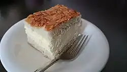 Literally "Bee sting", a German dessert made of a sweet yeast dough with a baked-on topping of caramelized almonds and filled with a vanilla custard, buttercream or cream.[5][6][7] |