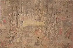 | Parinirvana (Death of Buddha), colour on silk 絹本著色仏涅槃図 kenpon chakushoku Butsu nehan zu |