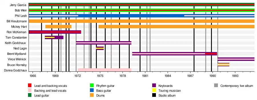 Over a span of 30 years the Grateful Dead had various combinations of members, as shown in the table.[1]