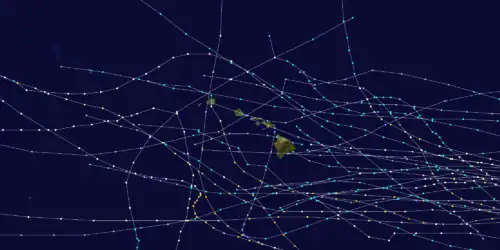 A Hawaiian hurricane is a tropical cyclone that forms in the Pacific Ocean and affects the Hawaiian Islands. Hawaii lies in the central Pacific, where about four or five tropical cyclones appear each year, although as many as fifteen have occurred, such as in the 2015 season; rarely do these storms actually affect Hawaii. Tropical cyclone records were not kept before the 1950s. Earlier windstorms that struck Hawaii were not labeled as hurricanes.[1] Extratropical cyclones are also common, causing considerable damage; they are known as Kona storms, but are not included in counts of hurricanes.