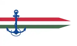 1921–1939 | Ensign of the commander of the Royal Hungarian River Guard | A horizontal tricolor of red, white and green bordered with a red, white and green „wolf-teeth” pattern, charged with the crowned small coat of arms on the hoist side. | 2:3 |