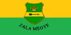 1991–2010 | Flag of Zala County | A horizontal bicolor of yellow and green with the county's coat of arms and the inscription "ZALA MEGYE" (Zala County) in the center. | 1:2 |