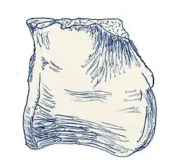 | Bruhathkayosaurus | 1987 | Kallamedu Formation (Late Cretaceous, Maastrichtian) | Reportedly exceptionally large but its fossils have been lost.[2] Its bones have been informally speculated to be misidentified tree trunks[3][4][5] but later research suggests at least the tibia is real[6] |