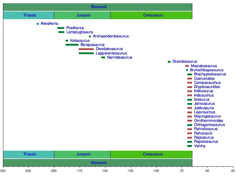 | Barapasaurus | 1975 | Kota Formation (Early Jurassic, Sinemurian to Pliensbachian) | Several individuals have been found associated with tree trunks, which may represent the aftermath of a flood[1] |