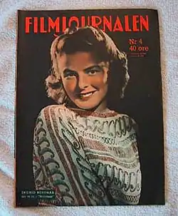 She appeared in a dozen films in Sweden, before being offered work in the American film industry. The movie that both she and historians cite as launching her international career was Intermezzo (1936), in which she shared the lead opposite Gösta Ekman. It brought her to the attention of producer David O. Selznick, who purchased the rights to the story and cast her as the female lead in the American version, Intermezzo: A Love Story (1939), with British actor Leslie Howard taking over the male lead.[4] Bergman signed a three-picture contract with the German production company UFA GmbH, intending to launch her career in German films. In the end, she only acted in the comedy The Four Companions (Die vier Gesellen) (1938), directed by Carl Froelich.[5] At the time of filming, she was pregnant with daughter Pia Lindström by her first husband, physician Petter Lindström, and performed with her abdomen bound.[6] Following her daughter's birth, she made the Swedish film June Night (1940), and three American films: Adam Had Four Sons (1941), Rage in Heaven (1941), and Dr. Jekyll and Mr. Hyde (1942).