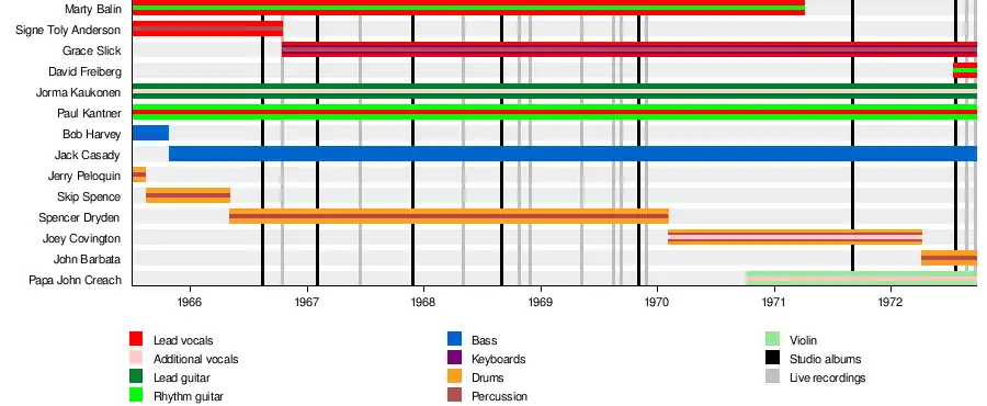 Jefferson Airplane was formed in mid-1965 by vocalist and guitarist Marty Balin. He selected rhythm guitarist and vocalist Paul Kantner, to join the band, the two men then recruited the remaining initial members: vocalist Signe Toly Anderson, lead guitarist and vocalist Jorma Kaukonen, double bassist Bob Harvey and drummer Jerry Peloquin.[4] Peloquin left a few weeks after the band's formation following an altercation with Kantner,[5][6] with Alexander "Skip" Spence taking his place.[7] Before the end of the year, Harvey was also fired and replaced by Jack Casady, who played electric bass, which was preferred by the band instead of double bass.[8] Spence and Anderson both left in 1966 after the recording of Jefferson Airplane Takes Off, with Spence replaced by Spencer Dryden in May,[9][10] and Anderson replaced by Grace Slick in October.[11]
