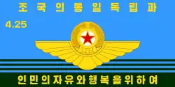 Reverse side of the flag of the Korean People's Army Air Force. | Identical to the former flag except the party symbol is placed within a design containing the façade of the WPK headquarters in Pyongyang. The slogan reads "Let us defend the Party's Central Committee headed by Dear Comrade Kim Jong Un with our lives!" (경애하는 김정은동지를 수반으로 하는 당중앙위원회를 목숨으로 사수하자!)[9] | |