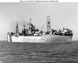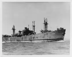 Basilan was built by Delta Shipbuilding Company. Her keel was laid on 5 February 1944. She was launched as Jacques Philippe Villere on 21 March.[5] Completed at the Waterman Steamship Corporation's yard at Mobile as Basilan for the United States Navy.[14] Delivered on 21 April.[5] A repair and supply ship, she was laid up in Suisun Bay in 1947.[4] She was sold to a shipbreaker in Portland, Oregon in June 1972.[14]