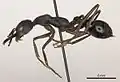 | Myrmecia flammicollis | — | Brown[32] | 1953 | M. flammicollis is only known from workers collected in Far North Queensland. Workers are medium in size, measuring about 13 millimetres (0.51 in), with a generally black body. The prothorax is orange-red, and the mandibles, antennal scapes and legs are reddish brown. The palpi, and parts of the antennae, mandibles and tarsi are yellow. This species is similar to Myrmecia petiolata, but is more slender and differs in colouration.[32] |