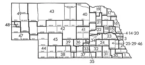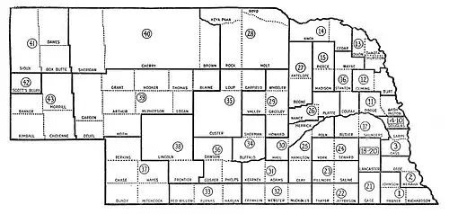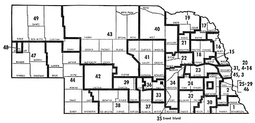 Records show that the apportionment of the legislative districts established for the 1936 election remained unchanged through the election of 1962.[1][2] The boundaries of these districts were restricted to fall along county lines. In the election of 1962, the voters of Nebraska passed a measure to loosen the county-line boundary restriction and to increase the number of legislative districts from 43 to 49.[3] This resulted in a new apportionment that renumbered all the existing districts and added two additional districts to Lancaster County, three additional districts to Douglas County, and one north of Douglas county. That plan went into effect for the election of 1964.