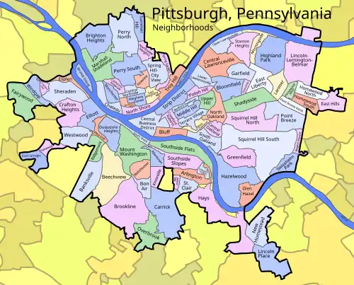 This is a list of 90 neighborhoods in the city of Pittsburgh, Pennsylvania, United States. Generally neighborhood development followed ward boundaries, although the City Planning Commission has defined some neighborhood areas.[1] The map of neighborhoods presented here is based on the official designations from the City of Pittsburgh.[2]