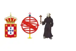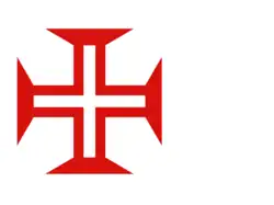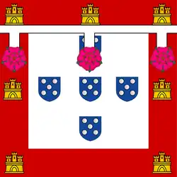 Heraldic banner (Five blue escutcheons each charged with an undetermined number of bezants on a white field. Border: red with yellow castles and a green cross of the Order of Aviz).