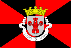 Rectangular red and black gyronny charged with the coat of arms of Bissau.