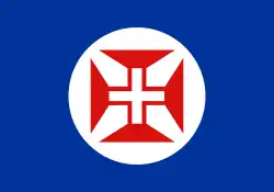 Portuguese national flag with the coat of arms of Portuguese Macau in the lower-right corner.