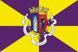 Coat of arms of Luanda on a rectangular purple and yellow gyronny