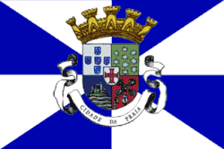 Rectangular white and blue gyronny charged with the coat of arms of Praia.