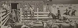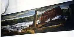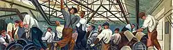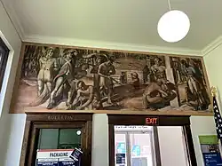 From 1934 to 1943, the Procurement Division of the United States Department of the Treasury commissioned murals in post office buildings across the country. Part of the New Deal, the stated objective of commissioning United States post office murals was to secure artwork that met high artistic standards[2] for public buildings, where it would be accessible to all people.[3] The murals were intended to boost the morale of the American people suffering from the effects of the Depression by depicting uplifting subjects the people knew and loved.[4] Murals produced through the Treasury Department's Section of Painting and Sculpture (1934–1943) were funded as a part of the cost of the construction of new post offices, with 1% of the cost set aside for artistic enhancements.[5] Murals were commissioned through competitions open to all artists in the United States.[6] Almost 850 artists were commissioned to paint 1,371 murals, most of which were installed in post offices;[5] 162 of the artists were women and three were African American.[5] The Treasury Relief Art Project (1935–1938), which provided artistic decoration for existing Federal buildings, produced a smaller number of post office murals.[2] TRAP was established with funds from the Works Progress Administration. The Section supervised the creative output of TRAP, and selected a master artist for each project. Assistants were then chosen by the artist from the rolls of the WPA Federal Art Project.[7]: 62–63