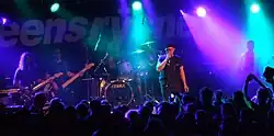 Because the name "the Mob" was not available, their manager urged them to choose a different name.[8] They reportedly ran out of ideas, and decided to name the band after the first song on their demo tape, "Queen of the Reich".[7] The spelling "Queensreich" was modified to prevent association of the band with Nazism; Kim Harris sent the demo tape and a band photo to a friend who wrote for Kerrang! magazine, resulting in a glowing review.[9] On the strength of the growing buzz that surrounded them in both the United States and Europe following this review, the Harrises released Queensrÿche's demo tape as a self-titled EP on their independent label 206 Records in 1983.[10][11] After the EP garnered international praise, receiving much airplay and selling an unusual number of copies for a small independent release,[9] Tate agreed to leave Myth and become Queensrÿche's permanent lead singer.[12][9] This line-up released six studio albums, including the concept album Operation: Mindcrime (1988) and Empire (1990) which included the highly successful power ballad "Silent Lucidity".