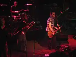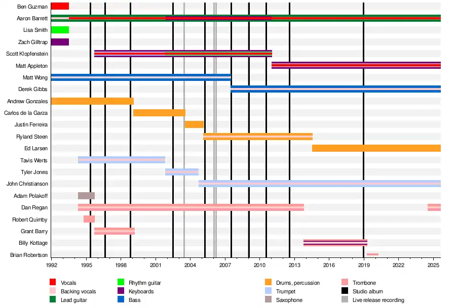 By 1994, the band had added Tavis Werts on trumpet, Dan Regan on trombone and Adam Polakoff on saxophone, who released Buy This! that year.[5] By the time the group recorded its debut full-length album Everything Sucks, Robert Quimby had joined as a second trombonist.[6] Quimby and Polakoff left before Turn the Radio Off, on which second trumpeter Scott Klopfenstein and new trombonist Grant Barry debuted.[7] During the tour in promotion of 1998's Why Do They Rock So Hard?, Gonzales left in February 1999 to "pursue other interests and spend more time at home".[8] He was followed the next month by Barry, who was dismissed for "personal differences".[9]
