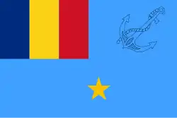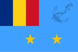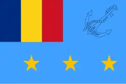 ?–present | Flag of the Romanian Naval Forces | A dark blue flag with coat of arms of Romanian Naval Forces in the centre with two stars in the left and in the right of coat of arms and surrounded by four anchors |