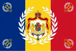 1902–1914 | Blue-yellow-red vertical tricolor with the country's coat of arms in the middle (slightly modified de facto), surrounded by a laurel wreath. In corners, the monogram of king Carol I of Romania, crowned and surrounded by a laurel wreath. | |