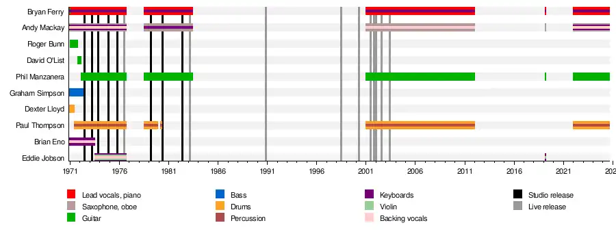Roxy Music are an English rock band formed by in 1970 by singer Bryan Ferry and bassist Graham Simpson, who were soon joined by saxophonist Andy Mackay, synthesizer player Brian Eno, guitarist Roger Bunn and drummer Dexter Lloyd. By the time the band recorded their first album in 1972, Bunn and Lloyd had both departed, with drummer Paul Thompson (who joined in 1971) and guitarist Phil Manzanera (who joined just before recording began in 1972) alongside Ferry, Simpson, Mackay and Eno. The band split in 1976, reformed in 1978 and split again in 1983. Since 2001, Roxy Music has reformed several times for tours, but have not released any studio material since 1982's Avalon album. The band's current line-up, who last reunited in 2022, includes Ferry, Mackay, Thompson and Manzanera, augmented by backing musicians.