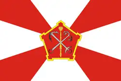 1992– Flag of Saint Petersburg An anchor and a hook crossing each other with a scepter in the intersection of the two, all on a red background.