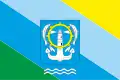 2016– Flag of Vladivostok The coat of arms of the city in front of a blue saltire on a red background.