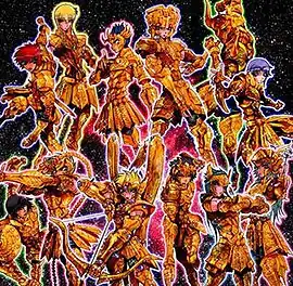 The Gold Saints (黄金聖闘士(ゴールド・セイント), Gōrudo Seinto) are the main protagonists of Episode.G. They possess full mastery of their Cosmo through their "seventh sense" (セブンセンシズ, Sebun Senshizu) and as such can move at the speed of light. They are the mightiest of Athena's Saints and guardians of the Golden Zodiac (黄金十二宮(ゴールド・ゾディアック), Gōrudo Zodiakku), the series of twelve temples that defends the Pope's chambers and the massive statue of Athena overlooking Sanctuary. Their constellations are those situated over the ecliptic, the twelve constellations of the zodiac.[9]