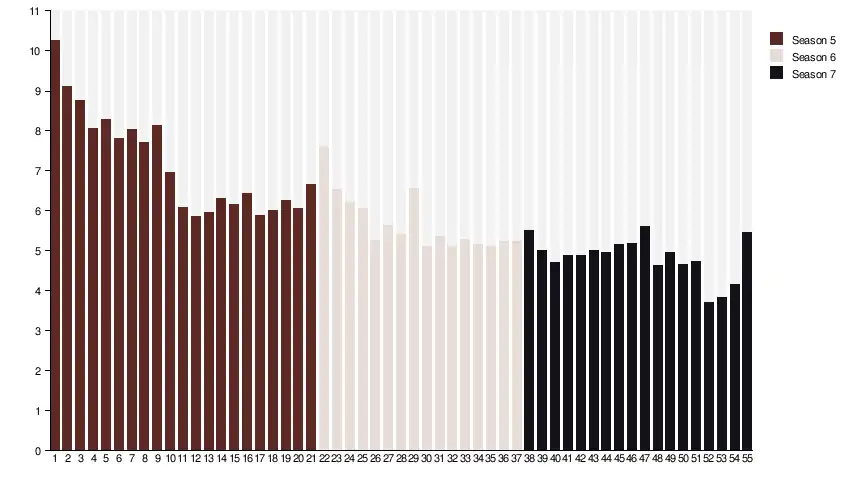 | 7 | 18 | October 5, 2017 | April 19, 2018 | 53 | 7.41[8] | |