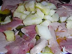Catalonia | salad | a salad that consists of shredded salt cod, tomatoes, onions, olive oil and vinegar, salt, and sometimes a garnish of olives or hard-boiled eggs. |