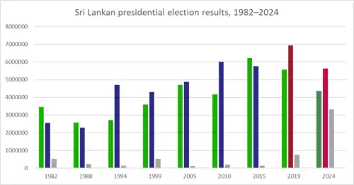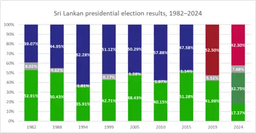 | 2024 | Anura Kumara Dissanayake | NPP | 5,634,915[a] | 42.30% | Sajith Premadasa | SJB | 4,363,035[a] | 32.75% | 3,321,666[a] | 24.95% | 13,319,616 | 79.46% | ||