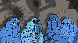 The Lurmen (also known as Mygeetans) are a diminutive, pacifistic lemuroid mammalian species native to the crystalline world of Mygeeto and also had a settlement on Maridun.[6] Their bodies were covered entirely in fur, which ranged in color from a dark brown to a white-gray, though they did wear garments. The Lurmen had heads protruding perpendicular from their chest two large golden orange eyes, a nose and a mouth. Each Lurmen had a tail, and they communicated through speech; Lurmen were able to speak Basic. Some Lurmen had the ability to curl up into a ball and roll along the ground, such as Wag Too. Lurmen were able to cover large amounts of ground at great speed.
