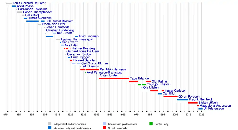 Prior to the creation of the office of prime minister in 1876, Sweden did not have a head of government distinct from its head of state, the monarch, who traditionally held all executive authority. Louis De Geer, the architect of the bicameral Riksdag of 1866, which replaced the centuries-old Riksdag of the Estates, became Sweden's first prime minister in 1876. As of 2022, the prime minister of Sweden is Ulf Kristersson, leader of the Moderate Party. The list below contains statistics about the tenures of each of the prime ministers of Sweden since 1876.