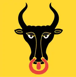 A diagonal tricolor of red (top), yellow and red with a bear inside the yellow stripe.