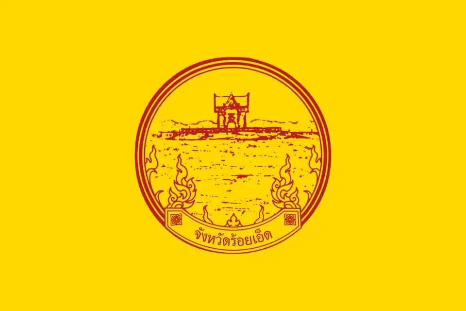 Unknown — 2004 | Roi Et Province | Yellow flag with the provincial emblem of Roi Et in the center, depicting an island in Bueng Phlan Chai. In the center of the island is a pavilion housing a Constitution Pedestal. The lower part of the emblem has Kanok patterns. |