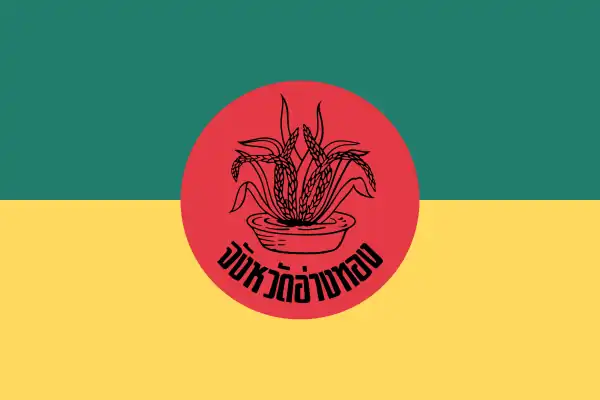 Flag of Ang Thong Province | Bicolor flag with yellow on the top half and green on the bottom half. In the center of the flag is the provincial seal. | |
