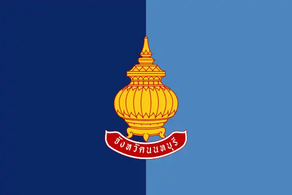 1942 — c. 1950s | Nonthaburi Province | Dark blue - blue flag divided vertically in half, with a decorative clay pot in the center accompanied by the provincial name. |