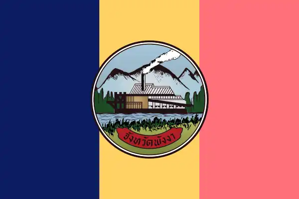 1942 — 2004 | Phang Nga Province | Blue-yellow-pink flag divided vertically, with the old provincial emblem in the center, featuring only a mining dredge and Khao Chang. |