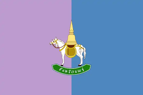 1942 — c. 1950s | Phrae Province | Vertical bi-color flag of purplish-pink and blue. In the center is Phra That Cho Hae on horseback, accompanied by the provincial name. |