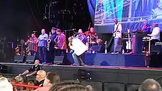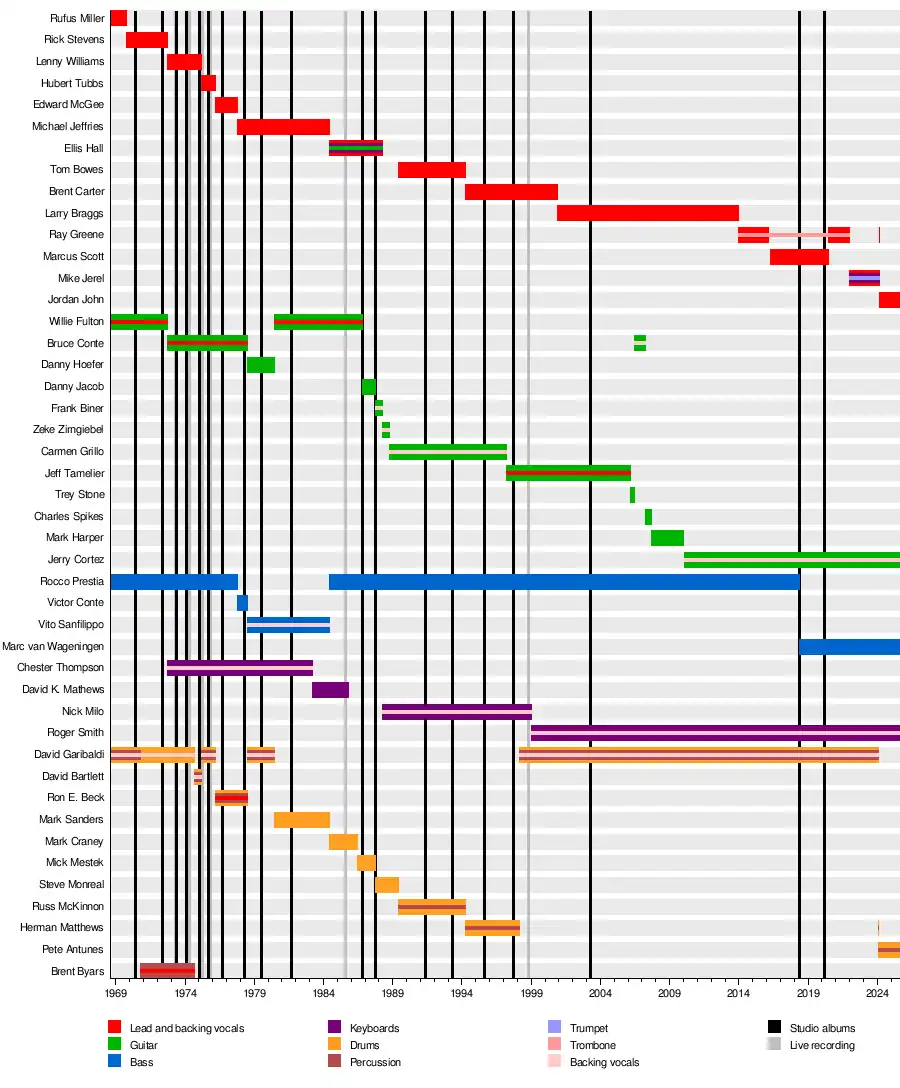 In August 2009, TOP founding member Mic Gillette rejoined the group after 25 years out of the lineup, when Mike Bogart departed "to pursue a career in music education".[64] In January 2010, Jerry Cortez replaced Mark Harper on guitar.[65] Gillette left again in February 2011,[66] temporarily replaced by the returning Lee Thornburg before Sal Cracchiolo took over that August.[67] In the summer of 2013, vocalist Larry Braggs announced that he would be leaving TOP at the end of the year.[68] He was temporarily replaced starting in September by Ray Greene, who later became an official member when Braggs left in December.[69][70] By April 2016, Marcus Scott had taken over the role of TOP's lead vocalist, after Greene left to join Santana in February.[69][71]